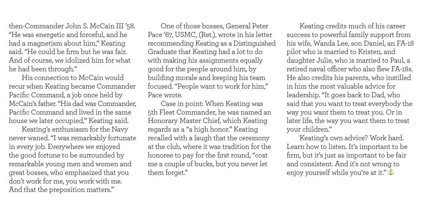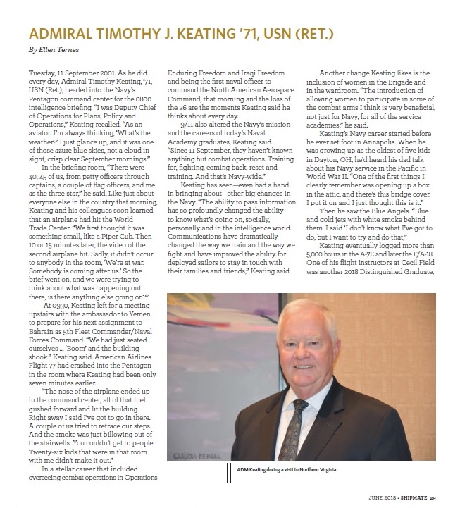 Admiral Tim Keating had a stellar career. He’d flown combat missions in Vietnam, held major command in Operation Iraqi Freedom, helped bring big changes to the Navy. But what he thinks about every day are the people who didn’t make it out of the Pentagon conference room on September 11, 2001, where he had been only seven minutes earlier. I had the pleasure of interviewing Admiral Keating and writing this profile for the Naval Academy alumni magazine, Shipmate, when his classmates named him a Distinguished Graduate in 2018.