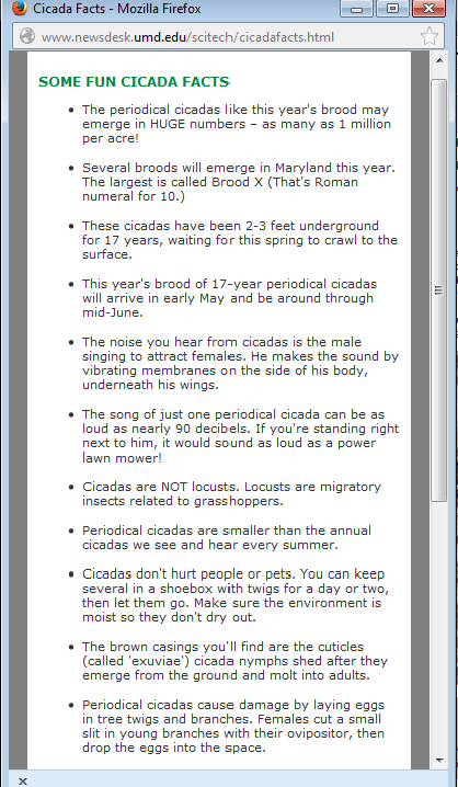 The page was a huge part of  UMd becoming a leading source on the cicada invasion.  Reporters called constantly, saying “I hear the University of Maryland is the place to go for cicada experts.”  When the last cicada had sung its lonely song in early July, the page had more than 80,000 hits. (Oh, what we could have done if Facebook and Twitter had been around!) More than 120 media outlets from as far away as Japan came to or called College Park to talk to our experts. Millions of people around the world had seen on television or read in print the words of our Cicadamaniacs. Our basic plan for making the website a hit holds today. Tell people what they want to know. Give them a way to get more information. Keep it concise, current, interesting.